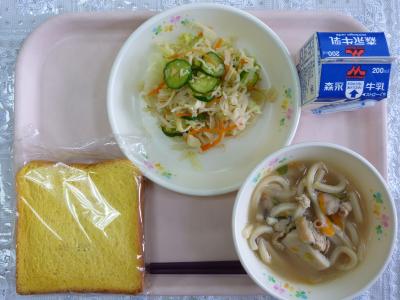 かみかみサラダ、きつねうどん、黒糖パン、牛乳