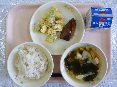 かつおの生姜煮、若竹汁、じゃが芋のカレーマヨ、麦ご飯、牛乳