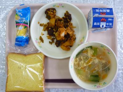 レバーのオーロラ和え、たまごスープ、カボチャパン、パイン、牛乳