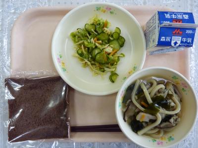 五目うどん、かみかみサラダ、ココアパン、牛乳