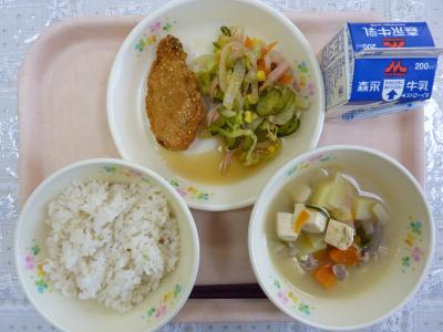 豚汁、アジ胡麻フライ、新玉ねぎのサラダ、麦ご飯、牛乳