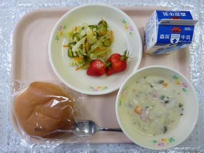 クラムチャウダー、フレンチサラダ、イチゴ、丸パン、牛乳