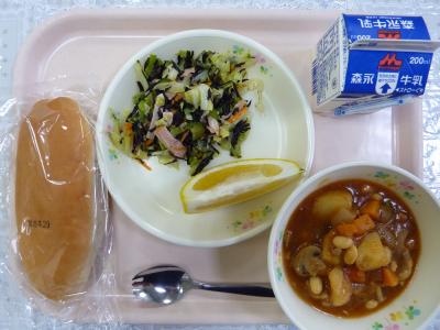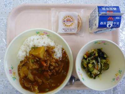 今日の給食には、「お祝いデザート(焼プリンタルト)」が付いていました。新しい1年生の入学と他の学年の進級をお祝いしたものだそうです。「ポークカレーライス」や「海藻サラダ」も、具だくさんでおいしかったです。