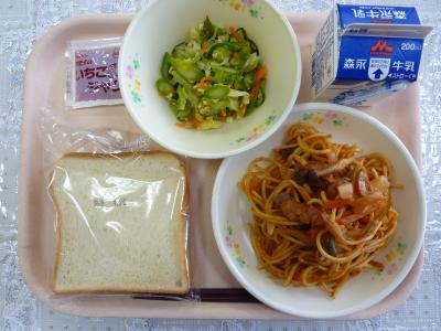 ナポリタン、アスパラサラダ、食パン、イチゴジャム、牛乳