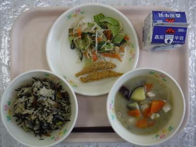 ひじきご飯、きびなごフライ、ごま酢和え、みそ汁、牛乳