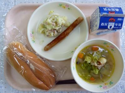 セルフドッグ、ミネストローネ、ジャーマンポテト、牛乳