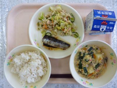 鰯のおかか煮、ニラ玉汁、切り干し大根のツナ和え、麦ご飯、牛乳