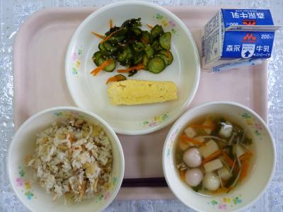 タケノコご飯、卵焼き、すまし汁、酢の物、牛乳