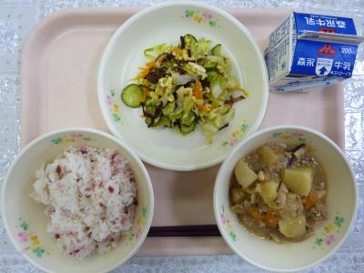 新じゃがのそぼろ煮、五色和え、カリカリ梅ご飯、牛乳