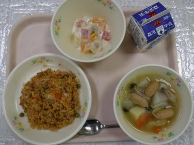 ポトフ、チキンライス、フルーツヨーグルト、牛乳
