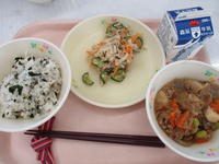 さて、今日は給食の話題ではありません。右側の写真にある「箸置き」です。これは、学びの教室2の6年生からプレゼントしてもらったものです。手芸用のクラフトテープ(紙バンド)を使って作り、ラッピングまですべて一人で行っていました。担任の三嶋先生は、作り方を実際に見せたり、「困ったときは言ってね」と声かけをしたり、少し時間をおいたり…。児童は、「がんばった」「できた」という達成感を感じて授業を終えていました。これこそが個別の支援なのだと思います。