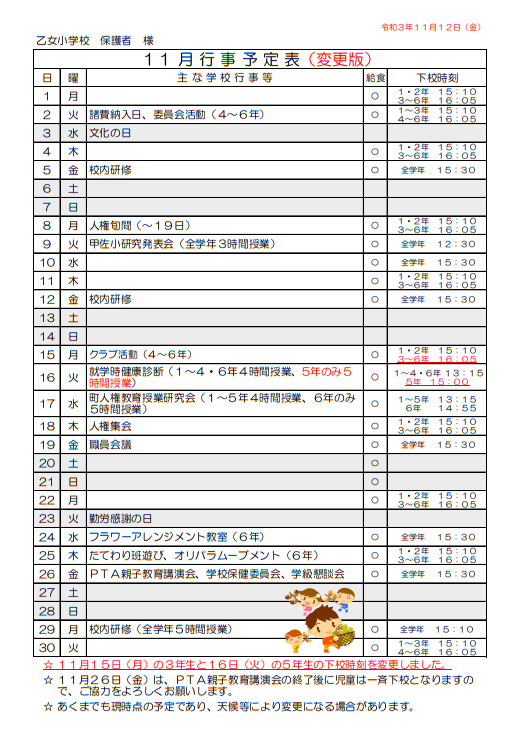 なお、3・5年生の下校時刻の変更については、本日(11月12日)児童を通して連絡しましたが、下校時間の変更で不都合がある場合は、担任までご連絡ください。