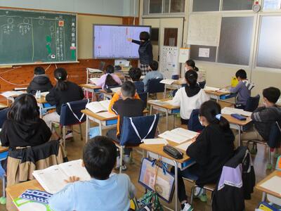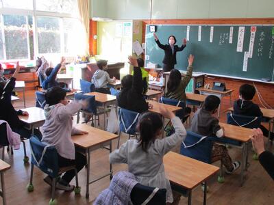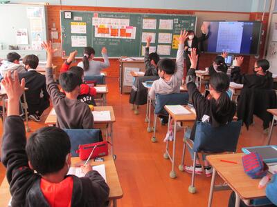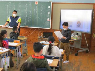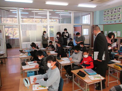 2年生では国語「冬がいっぱい」で、「自分が冬をかんじるものを、友だちに伝えよう」という学習に取り組みました。たくさんの人が見守る中、子供たちは「学校の行き帰り」「校区たんけん」「食事」「生活・行事」などで冬を感じるものを考え、積極的に発表することができました。