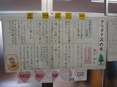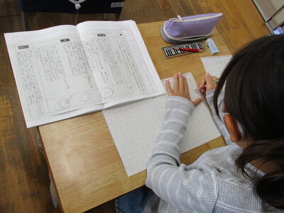 一昨日(11月29日)の1年生の算数に引き続いて、今日(12月1日)は4年生で国語の研究授業を行いました。今日の学習は、物語「プラタナスの木」のその後について想像し、自分の考えをまとめる内容でした。同じ物語でも感じ方はそれぞれですが、文章に書いてある内容を根拠に自分の考えを伝える活動に取り組みました。