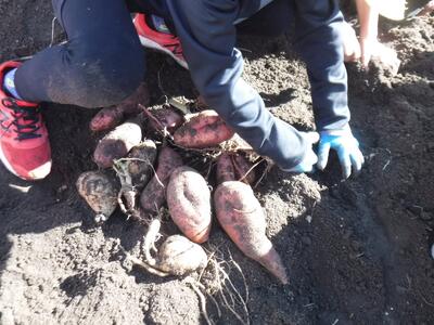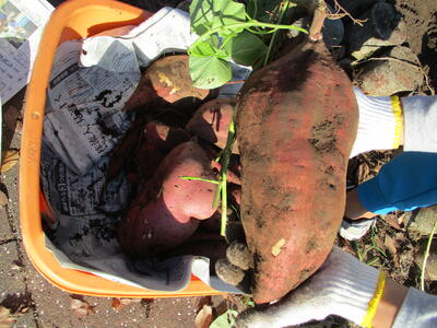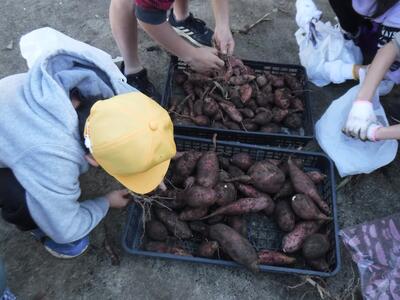今日の収穫作業は、密を避けるために、たてわり班の奇数班と偶数班に時間を分けて行いました。土を少し掘っただけで大小様々な大きさの芋がたくさん出てくるので、子供たちは大喜びでした。昼休みの短い時間で行いましたが、事前に5年生が芋のつるを切り、マルチシートをはがしてくれたので、短い時間でスムーズに活動に取り組むことができました。