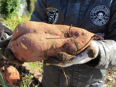 6月に全校児童で植えたさつま芋の収穫時季となりました。今日(11月19日)は、試し堀りを兼ねて学級園に植えたさつま芋を掘ってみたところ、両手よりも大きな芋が出てきました。その重さを量ってみると、なんと約3㎏もありました。