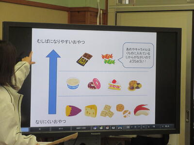 写真は1年生の様子です。子供たちは3名の方々のお話をしっかりと聞き、「食べたらすぐ歯を磨くようにします」「おやつを食べ過ぎないようにします」などの感想を発表することができました。