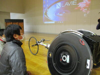 講演の合間にはパラリンピックのメダルや競技用車椅子に触れさせていただき、講演後は「プロのアスリートとして心がけていることは、どんなことですか?」や「落ち込んだり、諦めたりしたことはありますか?」などのたくさんの質問に丁寧に答えていただきました。