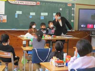 今日(11月24日)は、甲佐町から保健師さん、歯科衛生士さん、管理栄養士さんの3名に来校していただき、1・2年生で「よい歯の教室」を開催しました。