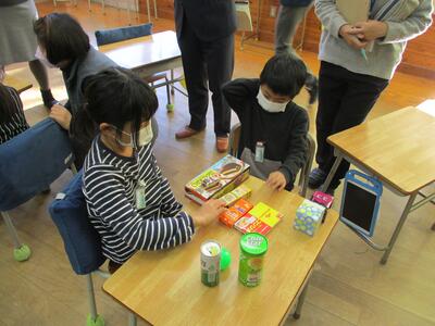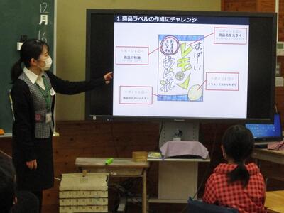 その第1弾として、前回(10月21日)は新商品のアイデアをグループで考え、学級全体で12の新商品のアイデアを提案しました。今日(12月16日)の第2弾は、提案したアイデアをもとに作っていただいた試作品を試食し、それを商品として売り出すために、商品ラベル(パッケージ)を考える活動に取り組みました。