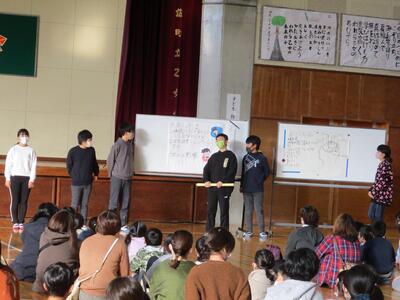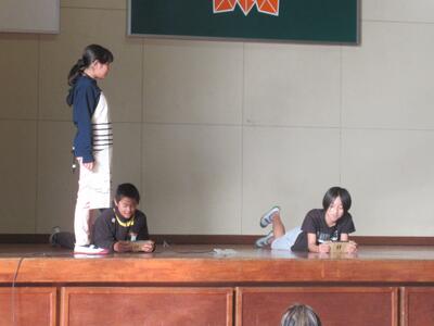 今回の集会では、はじめに人権擁護委員さんが作成されたシナリオをもとに、私たち教職員が演じる劇を披露しました。そして、劇を通して問い掛けられた問題を解決するためにはどうしたらよいのかを、たてわり班ごとに話し合いました。子供たちは小学生役を演じる私たちの姿に驚いたようですが、劇の内容を自分のこととして真剣に考え、具体的な解決方法を導き出していました。