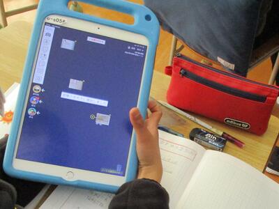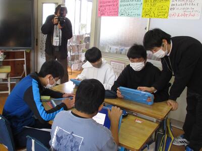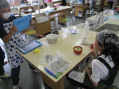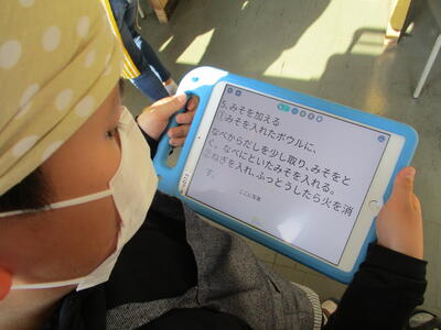感染防止のため、一人一人が自分のみそ汁1人分を作るようにしました。そのため、調理の手順もアドバイスは、ペアの友だちがタブレットを使って無言で提示しながら行いました。