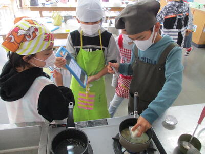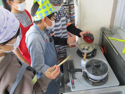 今日(12月3日)は、5年生が家庭科の調理実習でみそ汁作りに挑戦しました。これまで、感染症拡大防止のために学校での調理実習は控えていましたが、感染状況も落ち着いてきたことから、5年生にとっては初めての調理実習となりました。