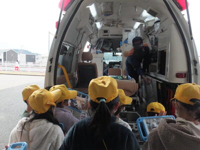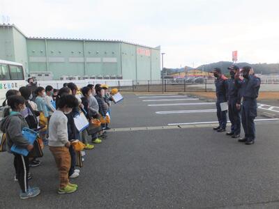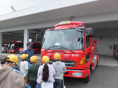 その学習を深めるために、今日(12月7日)は隣町にある「上益城消防署」へ見学に行きました。消防署では、施設の中や訓練の様子を見学させていただいただけでなく、いろいろな消防自動車の紹介や通信指令室の説明もしていただきました。