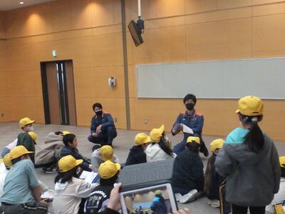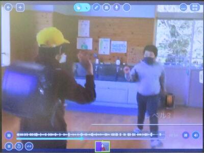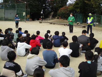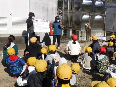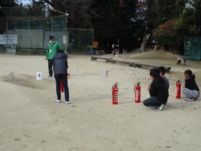 今回の訓練は、パソコン室を出火場所に想定し、運動場に避難しました。その後、防災士さんから火事が起きた時の心構えや消火器の使い方など、分かりやすく説明していただきました。