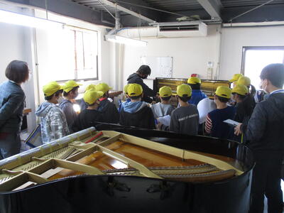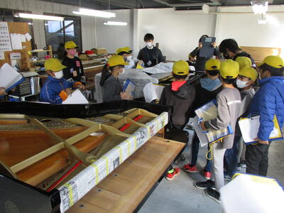 乙女小の4年生は、総合的な学習の時間で「乙女の達人を探し、達人にいろいろなことを学ぼう」というテーマを設定し、年間を通して学習をしています。その学習の一環として、今日(12月10日)は、校区内にある「古城ピアノ社修理工場」へ見学に行きました。