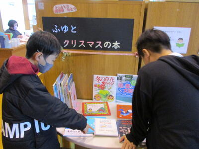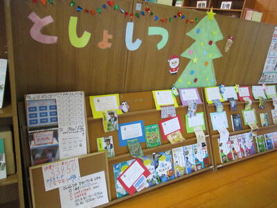 毎週火曜日に来校していただいている町の司書の先生の手によって、今月は図書室の飾り付けが「クリスマスバージョン」になりました。