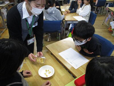 3年生の国語では、「食べ物のひみつを教えます」という学習に取り組んでいます。この単元では、説明文「すがたをかえる大豆」の学習を生かして、大豆と同じように姿を変えて食品になる材料について説明する文章を書くことを主な目標にしています。