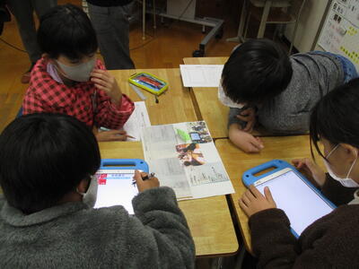 今日(11月15日)は、「はじめ」「中」「終わり」という文章全体の組み立てを考えた学習シートをもとに、下書きを書く活動に取り組みました。子供たちは「米」「麦」「肉」「たまご」などについて、「例」の書き方を工夫しながら文章を書いていました。
