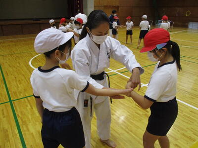 講師として、美里町にある「孔武会館」から3名の方に来校していただき、空手の礼儀作法や基本となる動きを教えていただきました。また、不審者に腕を捕まれた時の護身術も教えていただきました。
