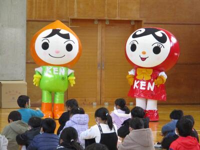 また、今日はスペシャルゲストとして、人権イメージキャラクターの「人KENまもるくん」と「人KENあゆみちゃん」にも来校してもらったので、子供たちは大喜びでした。