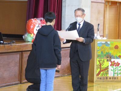 式では、まず校長からこれまでの活動の様子について振り返って感じたことを話しました。そして、児童代表が収穫した種を甲佐町教育長会に受け渡し、感謝状をいただきました。