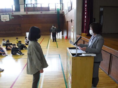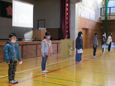 式では、はじめに6年生の代表児童が「3学期にがんばりたいこと」を発表しました。中学校への進学を控えた6年生の発表は、内容も態度もとても立派でした。