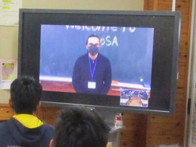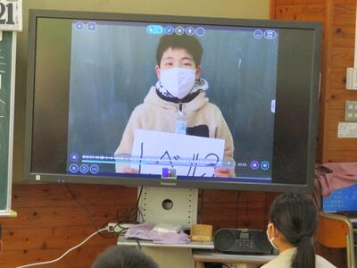 授業に先立ち、5年教室から全校児童にオンライン方式でご紹介しました。まだ来日されて間もない中、日本語で上手にあいさつをされ、6年生代表が歓迎の言葉を英語でお返ししました。