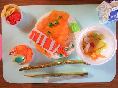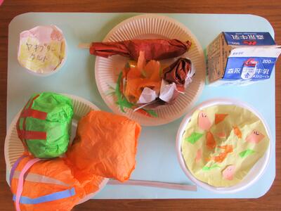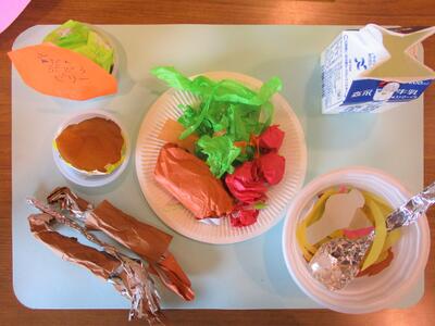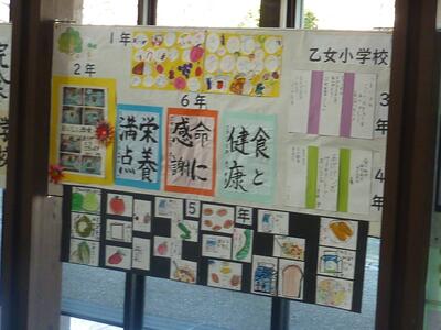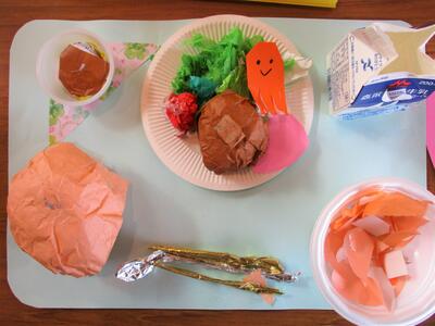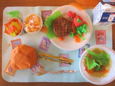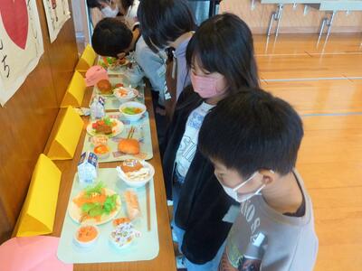 乙女小では、先週から給食週間にちなんだ様々な取組を行っています。2年生では、図工の時間に紙を使って給食を作る学習にグループで協力して取り組み、いろいろなメニューが完成しました。とても上手にできているので、すべての作品を紹介します。多目的ホールに展示してある作品を、1年生が「本物みたい」と言いながら見ていました。