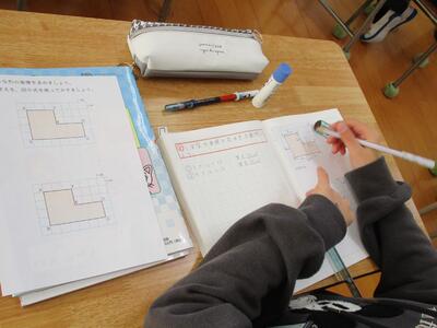 今日(1月26日)は上益城教育事務所から指導主事をお招きし、4年生で算数専科担当と学級担任による研究授業を行いました。そして、たくさんの先生が参観する中、4年生の子供たちは「L字形」の図形の面積を様々な方法で求め、自分の考えを堂々と発表することができました。