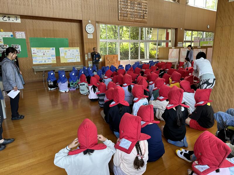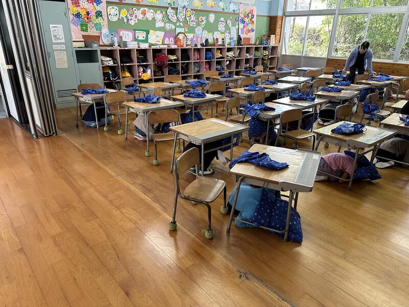 訓練では、地震の緊急放送をもとに机の下にもぐり、身を守るポーズをとりました。そのあとで学級で並んで避難を行いました。子供たちは、静かに素早く避難することができました。本校では、今年度も命を守ることを最優先に教育活動を進めていきます。