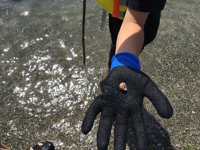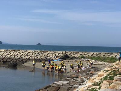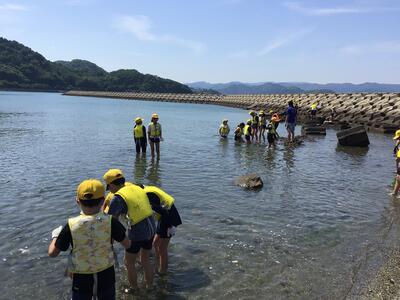 部屋の片付けでは布団のたたみかたに苦戦している子供たちでした。何とか合格をもらった後、海岸へ移動しました。磯観察では、海辺の生き物探しに夢中でした。