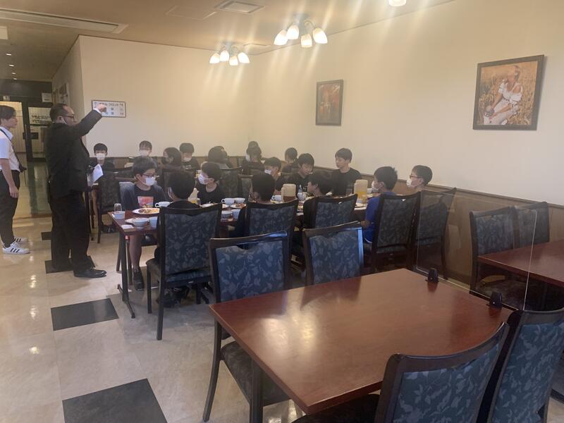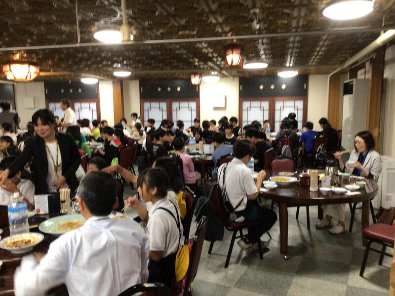 6年生は昼食会場で皿うどん、麻婆豆腐、唐揚げなどを、仲良く食べました。