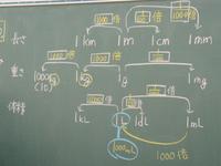 6年生の算数では、長さ・重さ・体積などの量の単位の仕組みを学習していました。長さの単位は「mm、cm、m、km」、重さの単位は「mg、g、kg、t」、体積の単位は「mL、dL、L、kL」をすでに学習しています。これらの単位に共通する秘密をさぐることで、単位の意味やその大きさをとらえやすくすることをねらったものです。子どもたちはすぐに「m(ミリ)は1000分の1」「k(キロ)は1000倍」を表すということに気付いていました。長さも、重さも、体積も、単位の仕組みがわかれば、量感がつかみやすくなります。