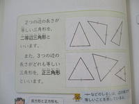 3年生の算数では、正三角形と二等辺三角形の学習をしています。正三角形を正確に書いたり、色紙で作った三角形が本当に二等辺三角形なのか確かめたりする学習でした。活動する中で、先生は度々「正三角形ってどんな三角形?」「頂点ってどこのこと?」など、図形の定義や基本的な事項について尋ねていました。学習は、前に学習したこととの積み重ねです。このちょっとした教師の問いかけが、子ども達の学習内容の定着につながっていきます。