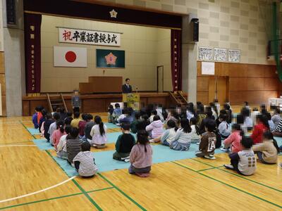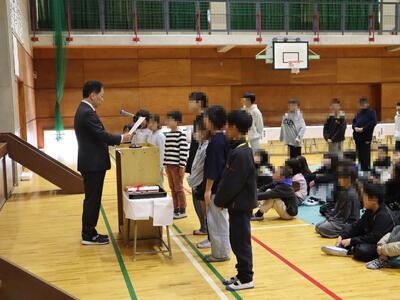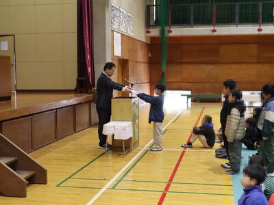 修了式の前に、「図画工作展」や「かしこくなろうWeek」の表彰を行いました。