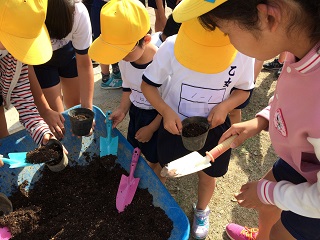 5月から始まった縦割り班活動。前回の縦割り班遊びにつづき、今日は落花生の種まきをしました。上級生が下級生をリードし、ポットへ土を入れたあと、落下生の種を一粒ずつまきました。