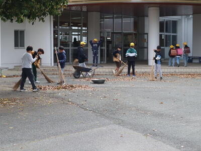 登校すると早速、落ち葉掃きのボランティアをする高学年の児童もいました。