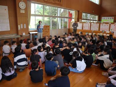 3校時は3~6年生で、自転車の乗り方やヘルメットの着用について考えました。