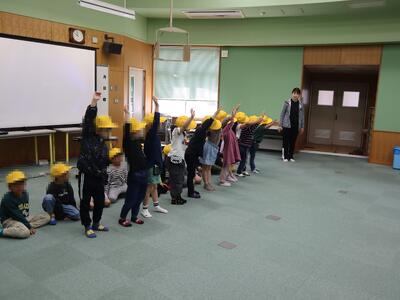 その後に、防災頭巾を被って避難を行いました。子供たちはみんな真剣に無言で避難することができました。